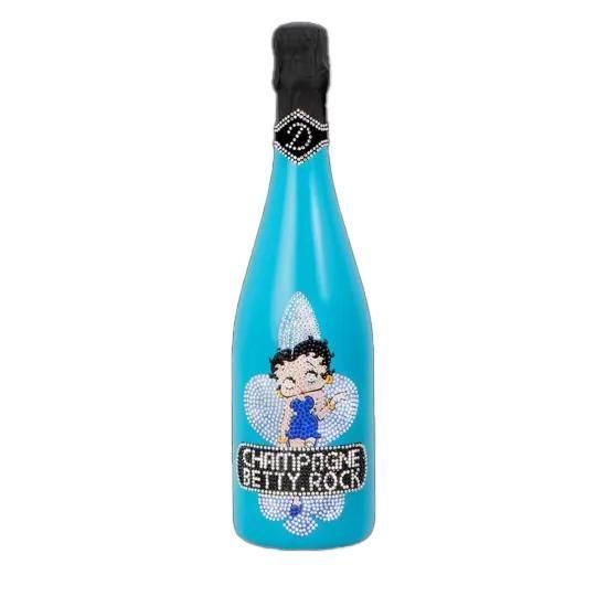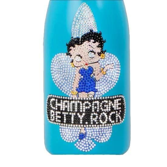 鮮やかなブルーボトルには、本商品限定デザインのBETTY BOOP™️がクリスタルロゴであしらわれ、存在感と特別感を演出します。 淡いペールブルーのツイード素材を使用したシャンパンBOXには、BETTY BOOP™️モチーフをアクセントとして配置。 さらに、パール付きのリボンやビジュー付きのハートチャームが上品に映え、細部までこだわり抜かれた仕上がりです。 中身の華やかさはもちろん、ボトルとBOXのビジュアルだけでも印象に残るため、特別なシーンを彩る一本として高い訴求力を持っています。 関連キーワード:BETTY.ROCK、ベティロック、BETTY BOOP、限定ボトル、シャンパン、スパークリングワイン、ブルーボトル、ギフト
